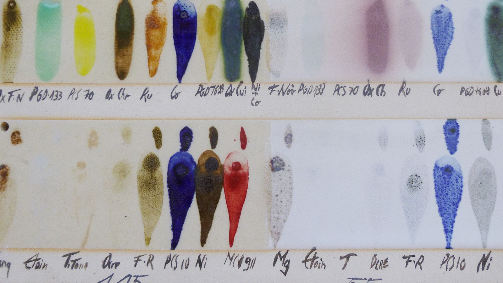 Oxyde de chrome : Cu2O3 (pm : 152). Oxyde très polyvalent, peut aller du rose au vert. Pouvoir de coloration entre 0.5% et 3% (vert intense). L’oxyde de chrome seul est réfractaire. A 1180° , le chrome se volatilise. A tester 5% d’oxyde d’étain + 1 % d’oxyde de chrome. Oxyde de manganèse : MnCO3 (pm : 115). Pouvoir de coloration entre 2% et 3% (Pourpre et brune)